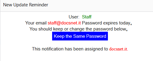 Contenuto: Ti avvisa che la password dell’email “staff@docsnet.it” sta per scadere oggi, invitandoti a cliccare su un pulsante blu “Keep the Same Password” per mantenerla invariata o cambiarla.