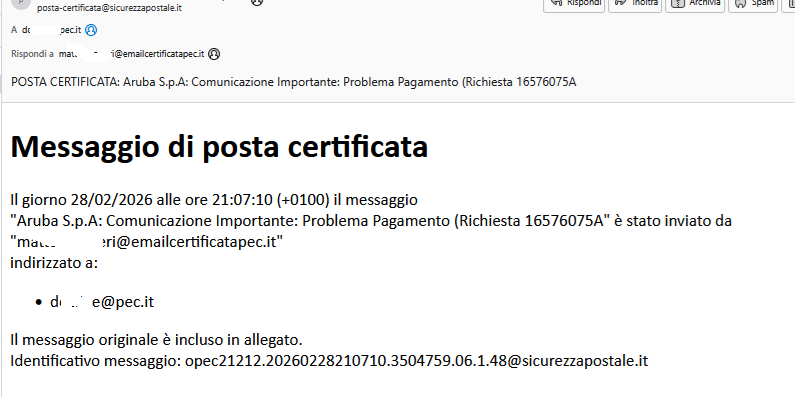 @emailcertificatapec.it) e non un dominio ufficiale dell’azienda (es.@pec.aruba.it), sospetta immediatamente. - Controlla sul portale ufficiale: Se ricevi una notifica di “problema pagamento” da Aruba o dal tuo gestore, non usare i link nell’email. Apri il browser, vai sul sito ufficiale del fornitore, accedi alla tua area riservata e verifica lì lo stato dei pagamenti.