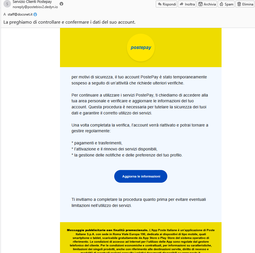 - Indirizzo: Servizio Clients PostePay <noreply@postebsv2dyn.io> o simile, e nel corpo appare staff@docsnet.it / staff@docsnet.io. PostePay / Poste Italiane non usa mai domini come dedyn.io, docsnet.it, postebsv2dyn.io o varianti simili. I canali ufficiali comunicano solo da domini come @poste.it, @postepay.it, @posteitaliane.it. I domini dinamici tipo *.dyn.io o *.dedyn.io sono spesso usati dai truffatori perché gratuiti o molto economici da registrare.