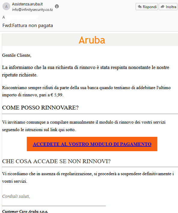 Negli ultimi anni, e in particolare negli ultimi mesi, stiamo assistendo a una vera e propria inflazione di email fraudolente che simulano solleciti di pagamento da parte di provider noti. Tra i nomi più abusati c’è Aruba, brand ampiamente riconosciuto nel panorama italiano del web hosting e dei servizi digitali.