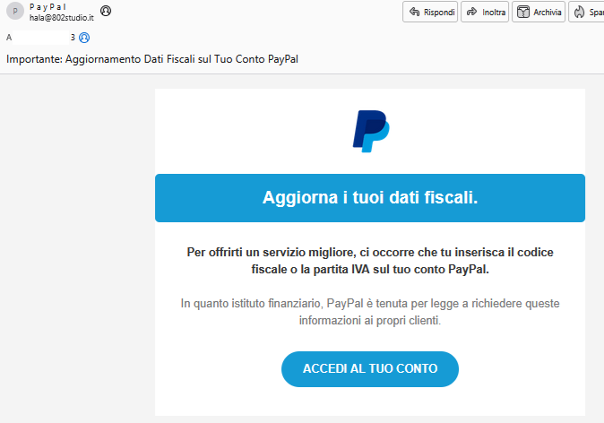 Negli ultimi giorni circolano email che chiedono di “aggiornare i tuoi dati fiscali” inserendo codice fiscale o partita IVA, usando logo e grafica di PayPal. Si tratta di phishing: messaggi fraudolenti progettati per rubare credenziali e dati sensibili.