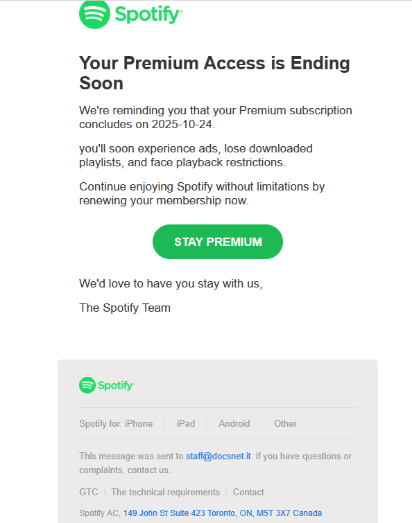 Il rischio principale è che il link “STAY PREMIUM” ti porti su una pagina web perfettamente identica a quella del servizio originale (in questo caso Spotify), ma gestita dai truffatori. Inserendo le tue credenziali, le consegneresti direttamente ai criminali che potrebbero: