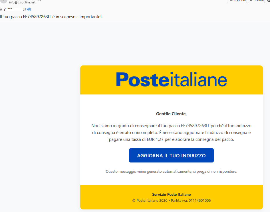 - Mittente sospetto: l’email proviene da indirizzi come info@thsonline.net o , completamente estranei al dominio ufficiale poste.it
