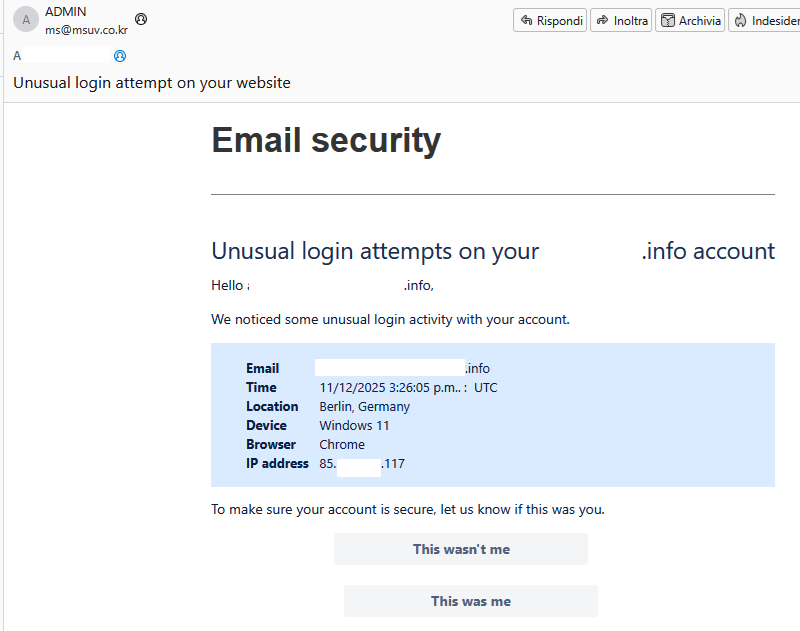Furto di credenziali: Cliccando su “This wasn’t me” o “This was me”, verrai probabilmente reindirizzato a una pagina falsa che imita il tuo provider email, dove ti chiederà di inserire username e password. I criminali cattureranno questi dati.