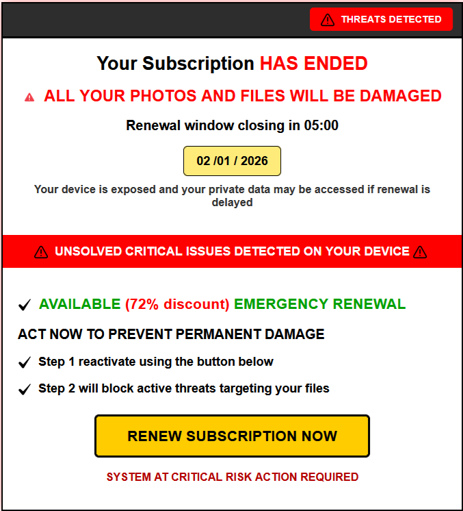 Cliccare sul pulsante “RENEW SUBSCRIPTION NOW”Vai su un sito falso → inserisci dati carta di credito / PayPal / Apple Pay → furto immediato di soldiAlto