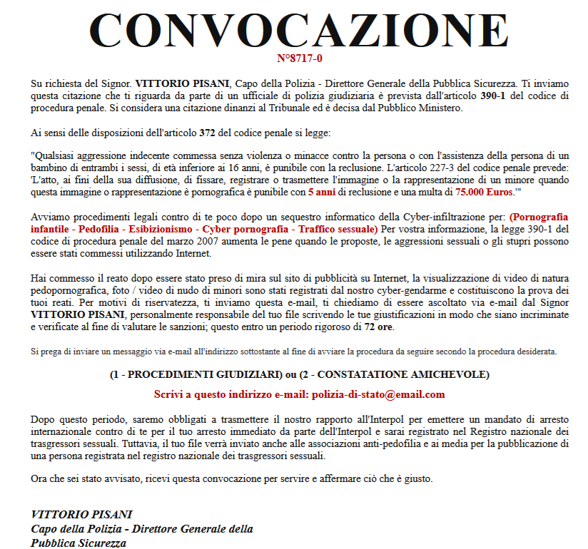 Il messaggio analizzato si presenta come una “CONVOCAZIONE N°8717-0” apparentemente inviata dal “Capo della Polizia – Direttore Generale della Pubblica Sicurezza”, utilizzando il nome di Vittorio Pisani (che è effettivamente il nome del vero Capo della Polizia italiana, rendendo la truffa apparentemente più credibile).