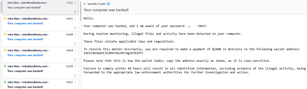 In un’epoca in cui le minacce informatiche evolvono a ritmi vertiginosi, alcune truffe si ostinano a riproporre formule stanche e obsolete, riciclando lo stesso copione da anni. Un esempio recente è arrivato nella casella di posta di un utente – non una volta sola, ma 50 volte in un solo giorno. L’email sosteneva che il computer fosse stato hackerato, esibiva una vecchia password («xxxxx2012!») come “prova”, parlava di «file illegali e attività illecite rilevate» e pretendeva 2400 dollari in Bitcoin per risolvere la questione in modo discreto, minacciando altrimenti di segnalare tutto alle autorità. Il dettaglio divertente? Quella password non veniva usata dal 2012 – cioè da 14 anni. Come ha notato l’utente, varianti identiche di questa stessa truffa circolano da circa 10 anni. Ci si chiede: perché queste estorsioni continuano a esistere quando sono così chiaramente inefficaci e fuori tempo massimo?