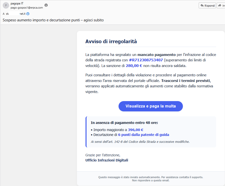 | Tecnica | Urgency phishing + brand spoofing (PagoPA + Ufficio Infrazioni) |