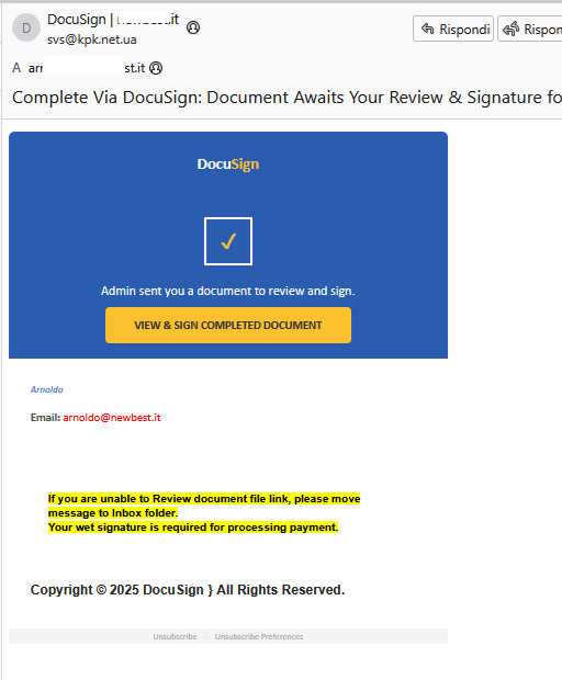 - Proviene da indirizzi come @docusign.net o @docusign.com